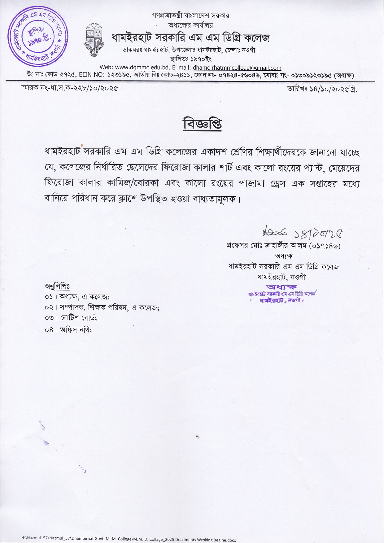 | 6 | 2025-12-04 | ধামইরহাট সরকারি এম এম ডিগ্রি কলেজের একাদশ শ্রেণির অর্ধ বার্ষিক পরীক্ষা, দ্বাদশ শ্রেণির নির্বাচনী পরীক্ষা ও ক্লাশ পর্যালোচনা সংক্রান্ত বিজ্ঞপ্তি। | View Download |