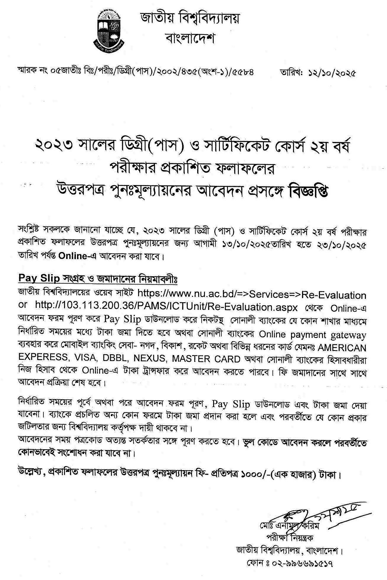 | 27 | 2025-10-12 | ২০২৩ সালের ডিগ্রি পাস ও সার্টিফিকেট কোর্স ২য় বর্ষ পরীক্ষার প্রকাশিত ফলাফলের উত্তরপত্র পুনঃমূল্যায়নের আবেদন প্রসঙ্গে বিজ্ঞপ্তি | View Download |
