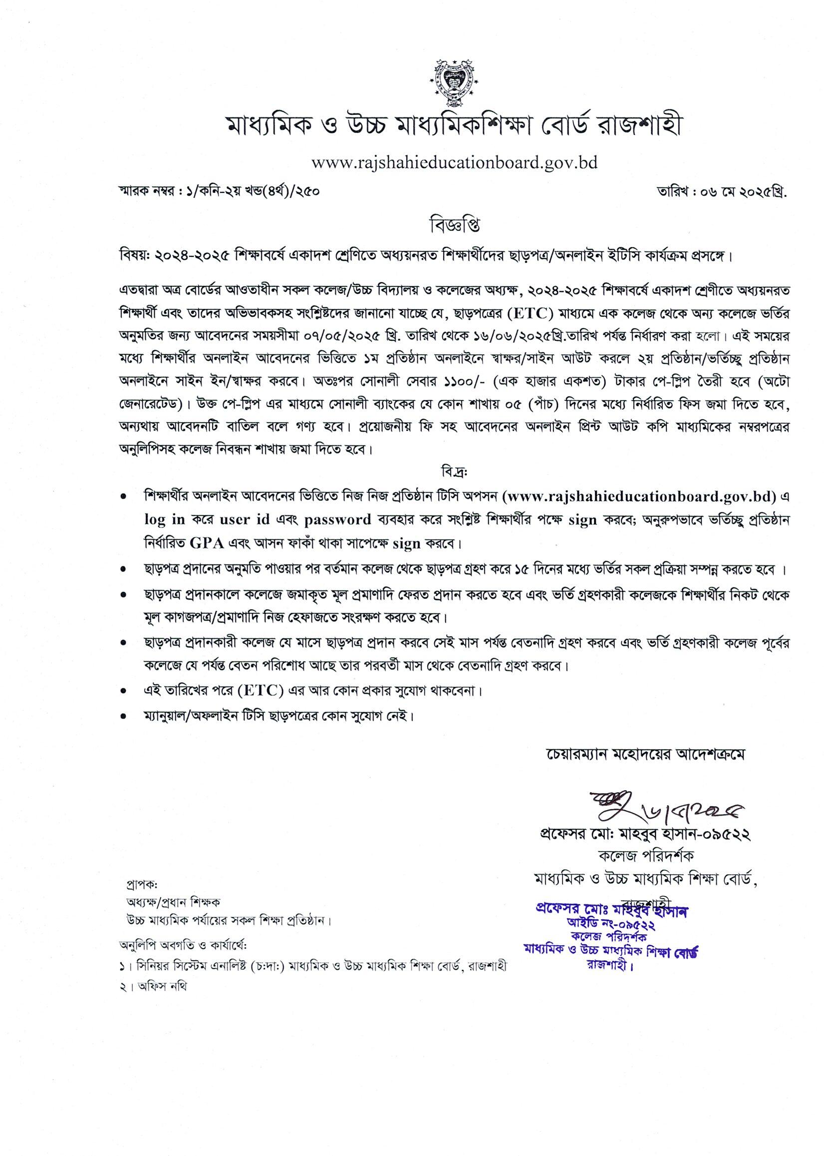 | 4 | 2025-12-09 | 2024-2025 শিক্ষাবর্ষে দ্বাদশ শ্রেণিতে অধ্যয়নরত শিক্ষার্থীদের ছাড়পত্র/অনলাইন ইটিসি কার্যক্রম সংশোধন প্রসঙ্গে। | View Download |